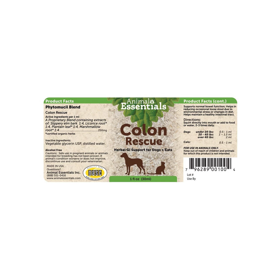 Animal Essentials Colon Rescue supports the gastrointestinal tract of dogs and cats alike. Packed with certified organic herbs like Licorice root, Slippery Elm inner bark, and Plantain leaf, designed to support a normal, and healthy digestion of your pet dog or cat.