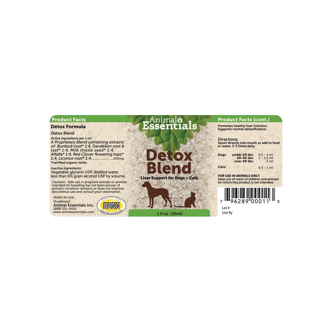 Animal Essentials Detox Blend features burdock, dandelion, and organic milk thistle that helps support your pet’s liver. Added alfalfa, red clover flowering tops, and licorice root aids in promoting a healthy liver function and normal detoxification as well as the elimination of toxins from the body. This liver supplement can be added to your pet’s food or water, or directly into the mouth if necessary.