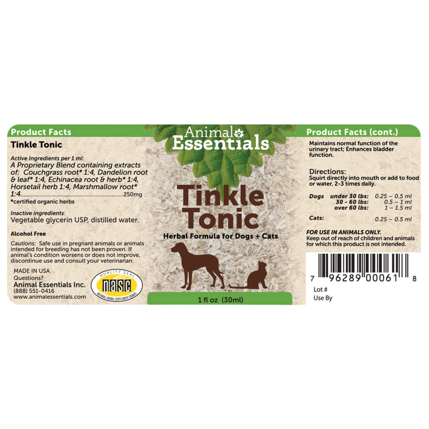 Animal Essentials Tinkle Tonic herbal formula offers a holistic approach against urinary issues. Tinkle tonic is designed to soothe and protect the urinary tract without irritating the kidneys. While it is especially useful for cats, it provides urinary support for dogs as well! The Tinkle Tonic remedy is an antimicrobial, soothing and tonifying combination of Couchgrass, Echinacea (purpurea), Marshmallow, Dandelion, and Horsetail.