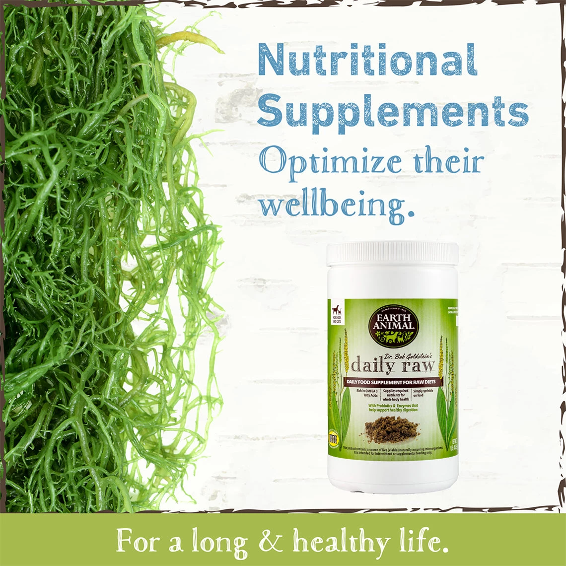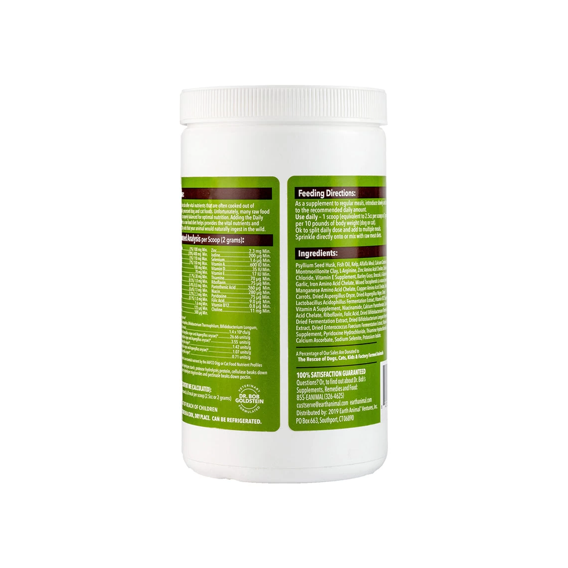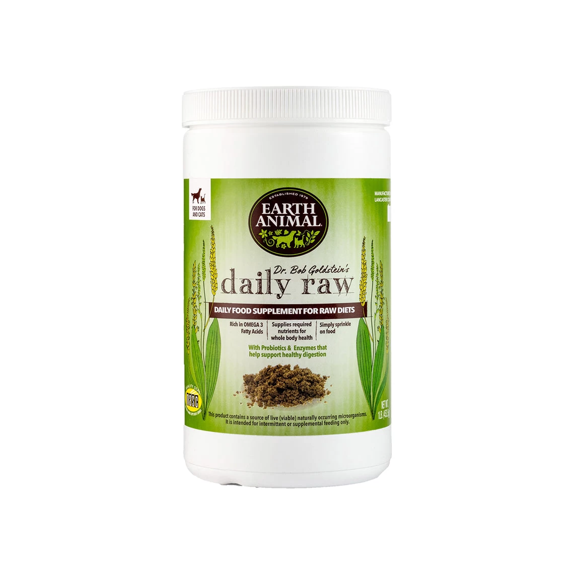 Earth Animal Daily Raw Food Nutritional Supplement Powder is an all-in-one multivitamin plus mineral supplement to add to raw food diets. It contains essential fatty acids, vitamins, minerals, digestive enzymes, probiotics, & high levels of Vitamin E that will give the nutrients necessary when feeding raw food. Dr. Bob Goldstein formulated this well rounded supplement with his 40 years of veterinary experience.