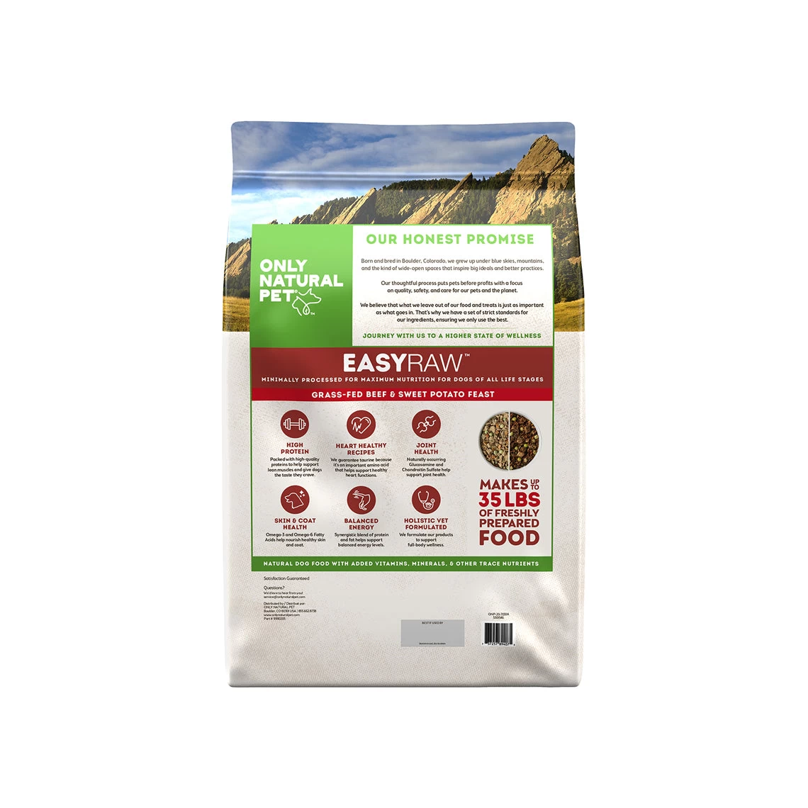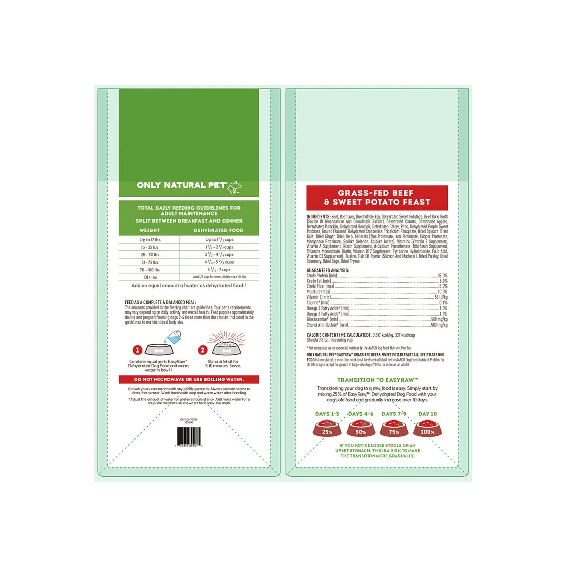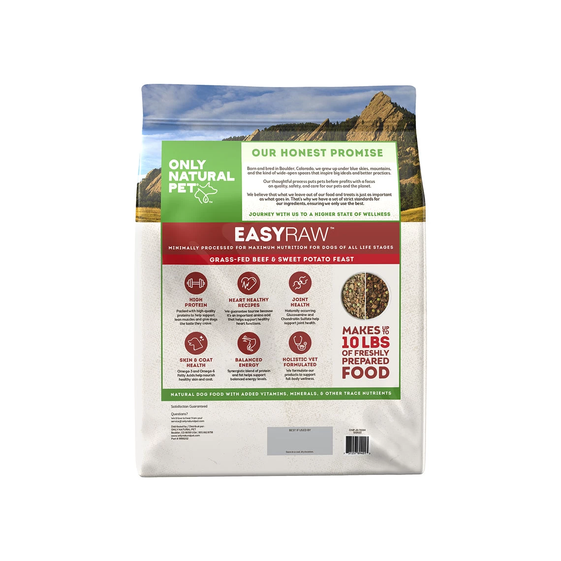 Only Natural Pet EasyRaw Grass-Fed Beef & Sweet Potato Feast Dehydrated Dog Food is made with freeze-dried, raw beef and dehydrated vegetables and fruits. These minimally processed ingredients combine for maximum nutrition, freshly prepared meal that is complete and balanced for adult dogs.