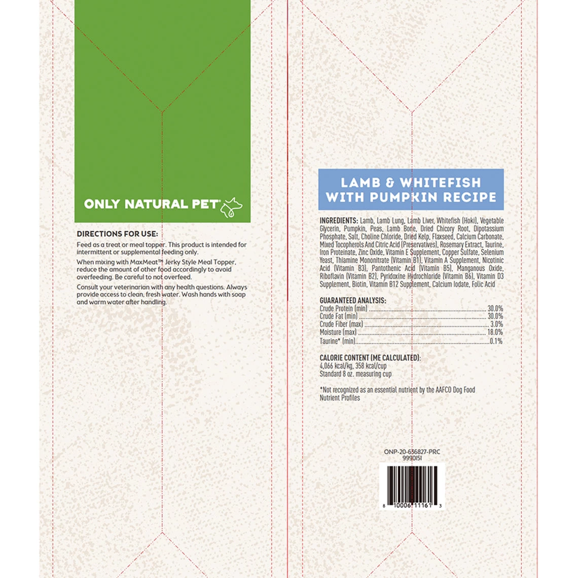 Only Natural Pet MaxMeat Lamb & Whitefish with Pumpkin Recipe Air-Dried Dog Food Topper gives your dog the topper nature intended. Packed with protein from pasture-raised lamb and wild-caught hoki whitefish, along with naturally occurring vitamins, minerals, amino acids, and pumpkin for added digestive support.