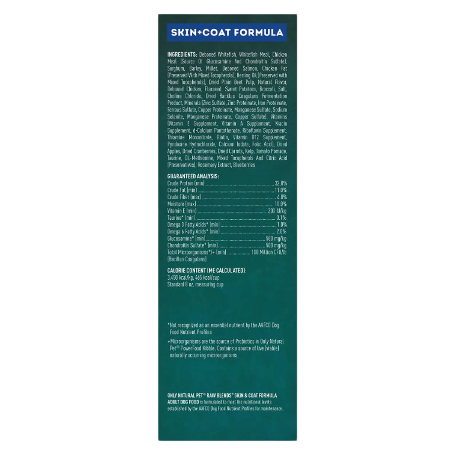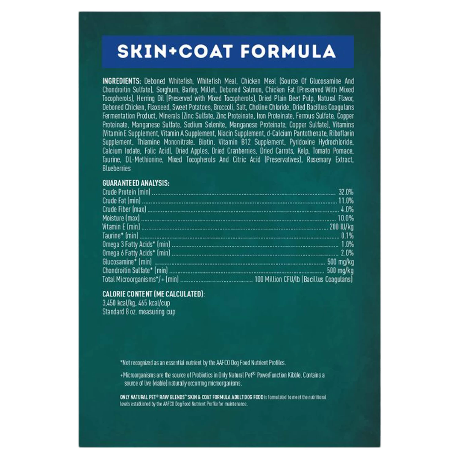 Only Natural Pet Raw Blends Skin and Coat Dog Food is a high-protein, legume free, dry dog food with ancient grains and raw inclusions. Featuring two foods in one, it has an ancient grain-inclusive kibble with sorghum, barley, and millet, combined with freeze-dried raw superfood bites.