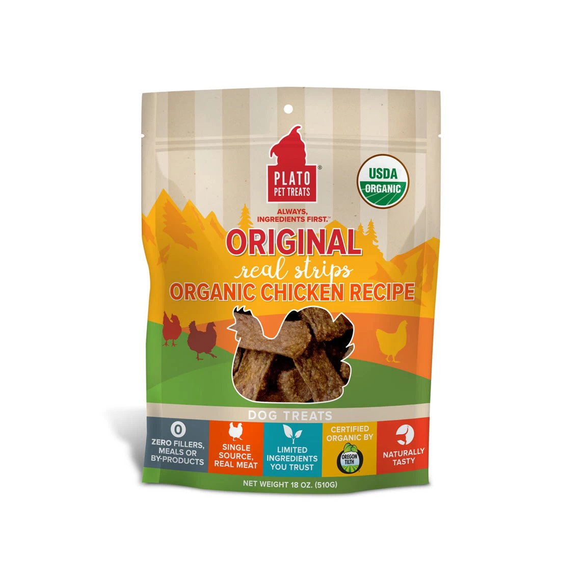 Plato Original Real Strips are single protein, soft textured, meaty treats for dogs. These chomp – able treats feature real meat as the first ingredient! In order to retain the natural nutrients, Plato air-dries these limited ingredient treats in small batches in their USA factory. Foregoing the high heat baking process means these treats are chewy and easy to break apart for training.